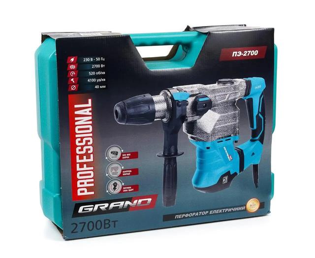 Цю модель виробник забезпечив досить потужний і досить оборотий двигун потужністю 2700 ватів із силою удару 13,0 Дж. Весь інструмент Grand вже давно здобув популярність завдяки своїй якості та став альтернативою дорогим брендам. Перфоратор Grand ПЕ-2700 теж виправдовує ці слова. Уся продукція компанії Grand має міжнародні сертифікати ISO. Перфоратор Grand ПЕ-2700 — виділяється високою якістю й надійністю корпус виробу виготовлений із пластику та металу, що захищає від механічних пошкоджень і перегрівання.