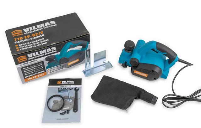 Електрорубанок Vilmas 710-EP-82/2 призначений для стругання деревини в розмір, надання їй гладкості. Рубанок обладнаний електродвигуном потужністю 710 ватів, що і передбачає можливість зняття товщини стружки 2 мм — глибиноміром, який дає змогу встановити глибину оброблення поверхні. Швидкість обертання барабана 14500 обертів на хвилину дає змогу отримати високу якість стругання й чистоту оброблюваної поверхні. Максимальна глибина вибірки чверті — 10 мм.