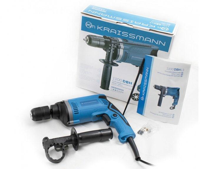 Дриль Kraissmann 1100 DBH 13 призначений для свердління отворів у різних матеріалах. Дриль обладнаний режимом свердління та свердління з ударом. Також дриль має функцію реверсу, регулювання обертів за допомогою натискання кнопки. Для зручності використання інструмент обладнаний додатковою ручкою й упором для вимірювання глибини свердління.