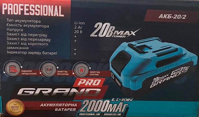 | Тип призначення | Універсальний акумулятор Grand АКБ — 20 В/2 (2 А·год) |